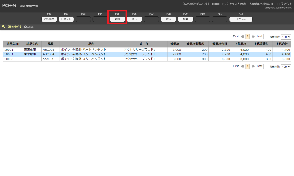 メニューキーの「新規」ボタンをクリック、またはキーボードの「F05」キーを押下します。