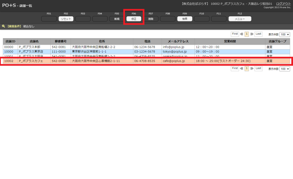 循環棚卸の設定に変更したい店舗マスタを選択し、メニューキーの「修正」ボタンをクリック、またはキーボードの「F06」キーを押下します。