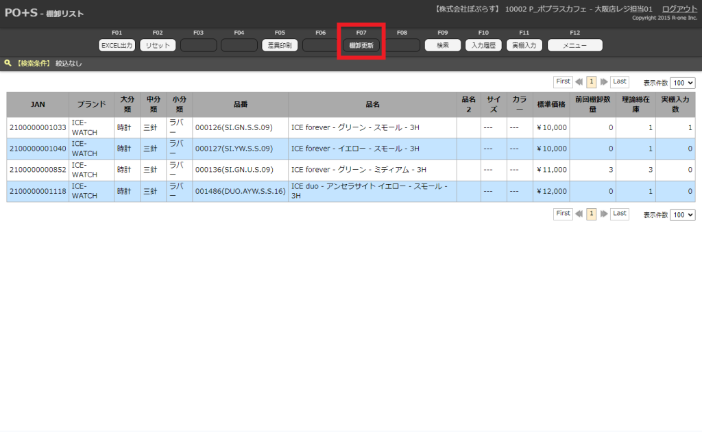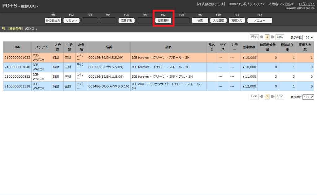 棚卸リスト画面でメニューキーの「棚卸更新」ボタンをクリック、またはキーボードの「F07」キーを押下することで、表示されている対象データを保存します。差異がない場合でも保存されます。