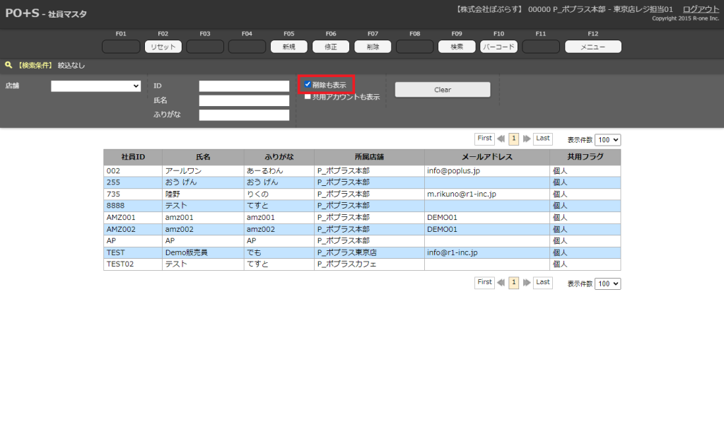 以前削除した社員マスタを含んだ検索結果が表示されます。