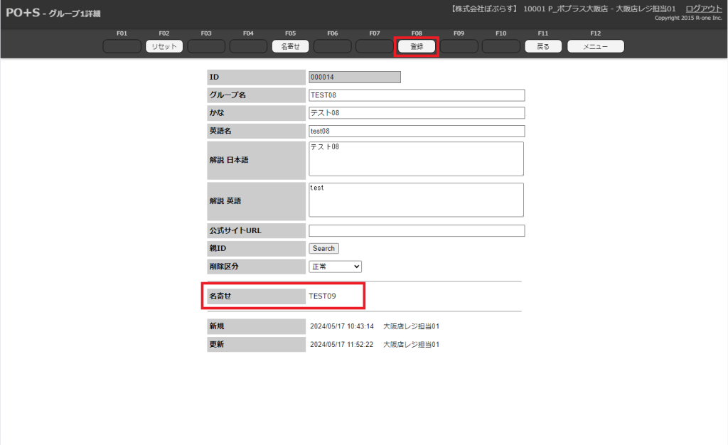 メニューキーの「登録」ボタンをクリック、またはF08キーを押下します。