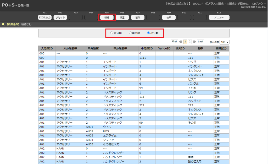分類マスタ一覧から新規登録する分類種別を選択したうえで、メニューキーの「新規」ボタンをクリック、またはキーボードのF05キーを押下します。