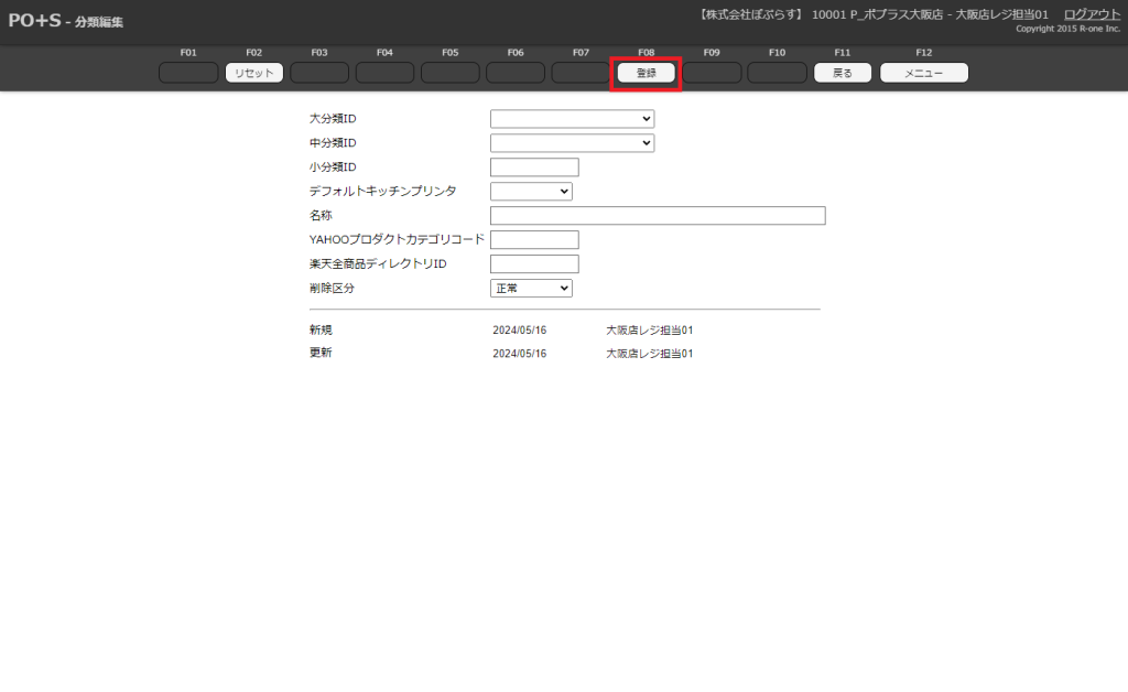 新規登録画面が表示されます。任意の情報を入力し、メニューキーの「登録」ボタンをクリック、またはキーボードのF08キーを押下します。