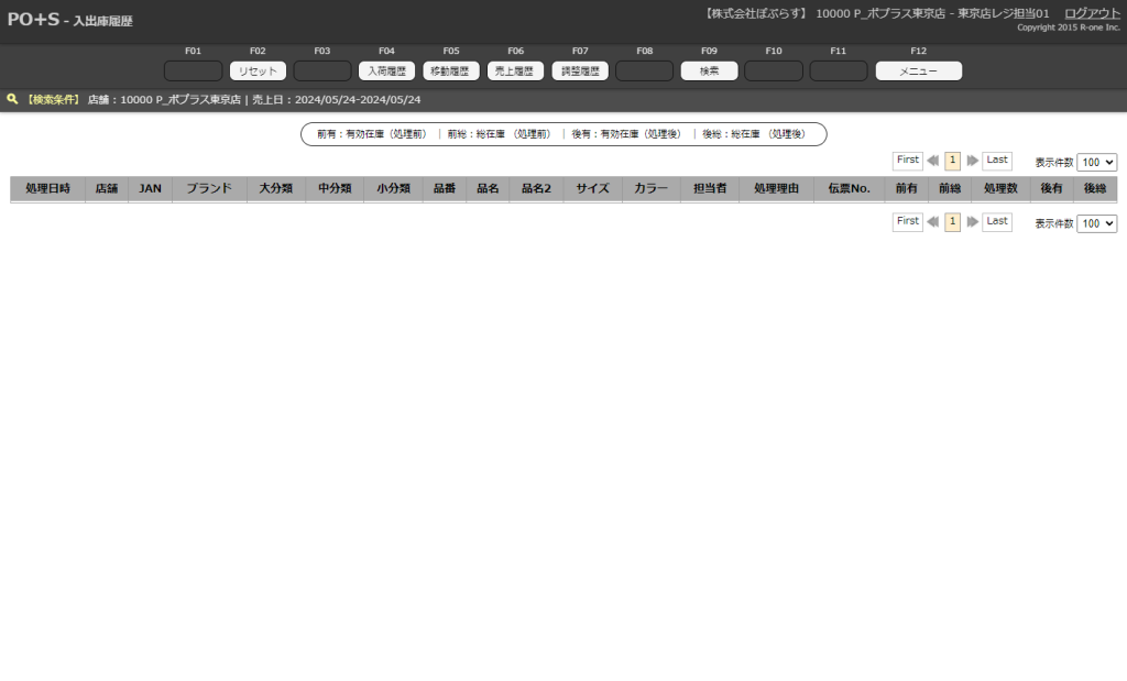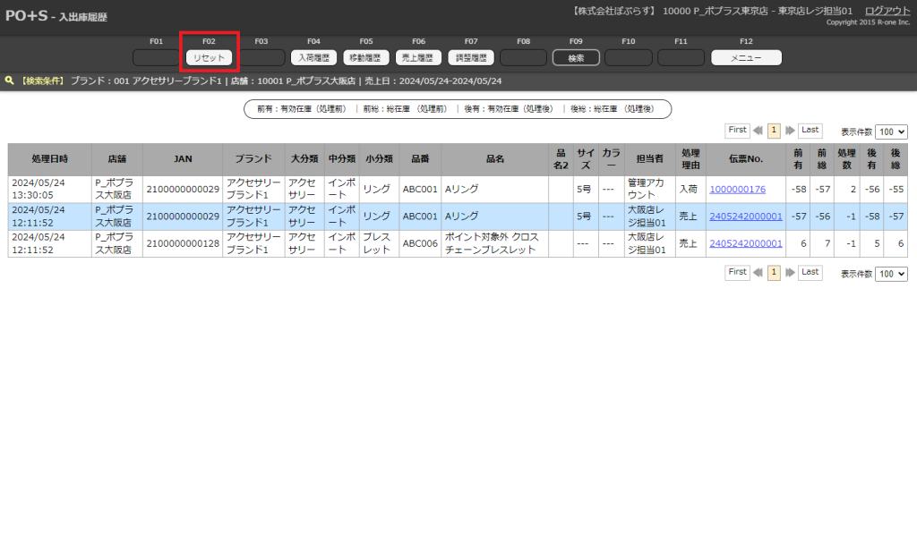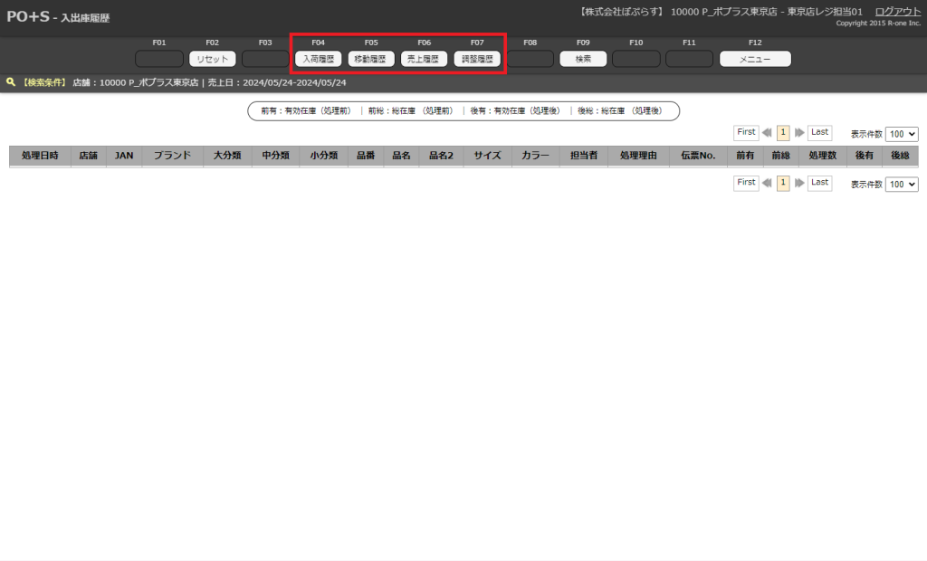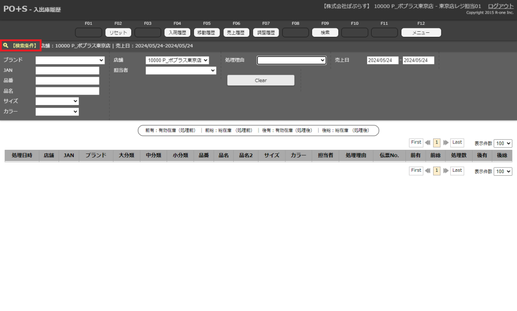 検索条件がすべてクリアになり、入出庫履歴一覧が表示されます。