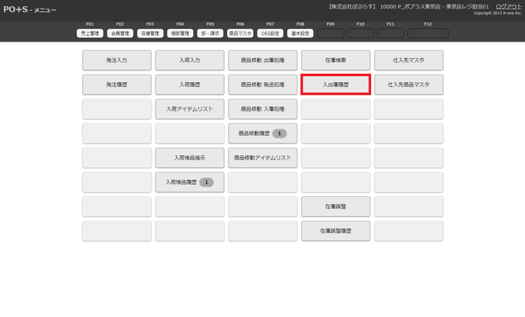 メニューボタン一覧から「入出庫履歴」ボタンをクリックします。
