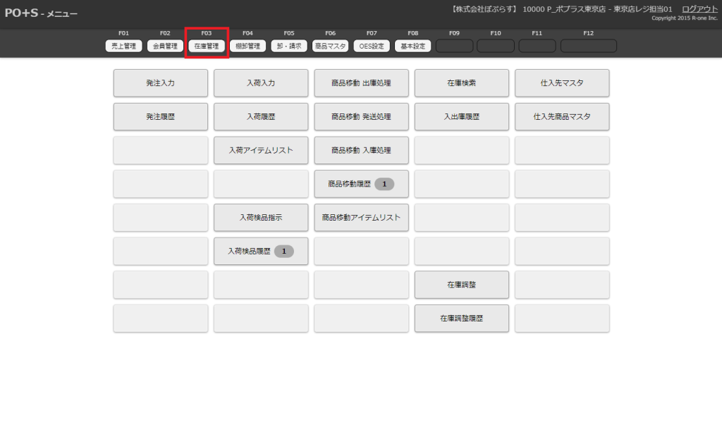 メニューキーの「在庫管理」ボタンをクリック、またはキーボードのF03を押下します。