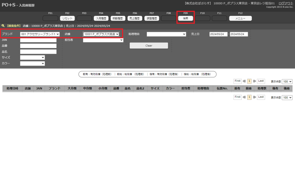 任意の情報を入力し、メニュキーの「検索」ボタンをクリック、またはキーボードのF09を押下します。