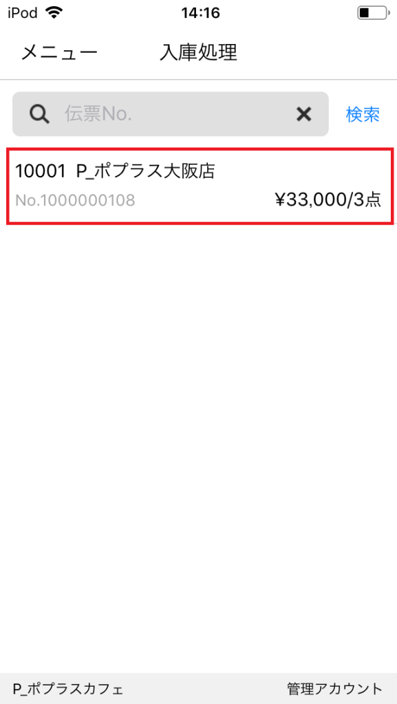 PO+S READER 商品移動 PO+S READER 入庫処理 COPY Title&URL メニュー画面で「入庫処理」アイコンボタンを押下します。 入庫処理をする伝票を押下します。 「登録」ボタンを押下します。 ポップアップ画面が表示されるので、「OK」を押下します。 入庫処理が完了します。 商品移動履歴画面にも反映されます。