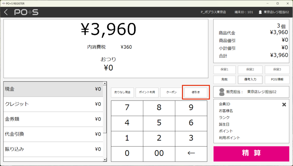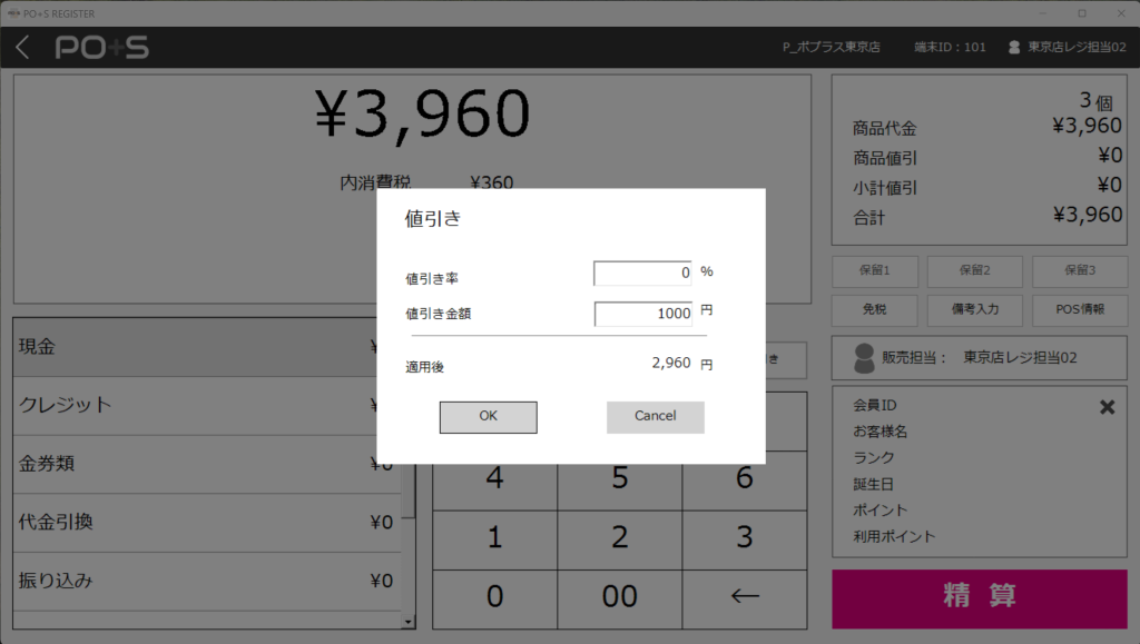 値引き率および値引き金額を入力するポップアップウインドウが表示されます。