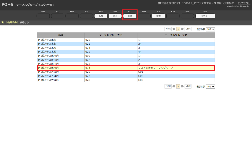 削除したいテーブルグループマスタを選択します。メニューキーの「削除」またはキーボードのF7キーを押下します。