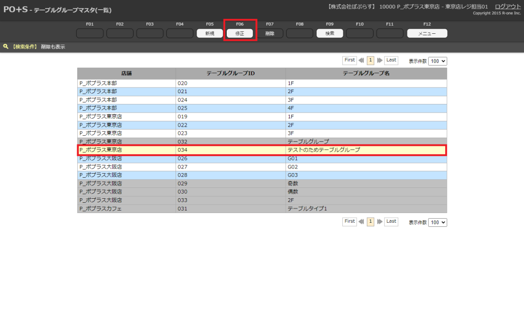 復元させたいテーブルグループマスタを選択します。メニューキーの「修正」またはキーボードのF6キーを押下します。