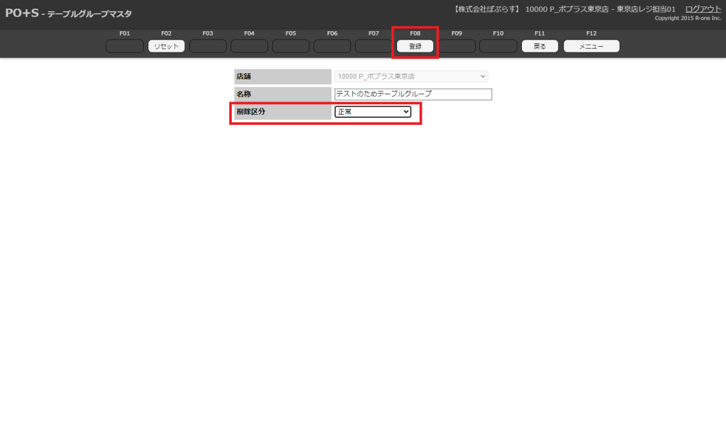 削除区分を「正常」に変更し、メニューキーの「登録」またはキーボードのF8キーを押下します。